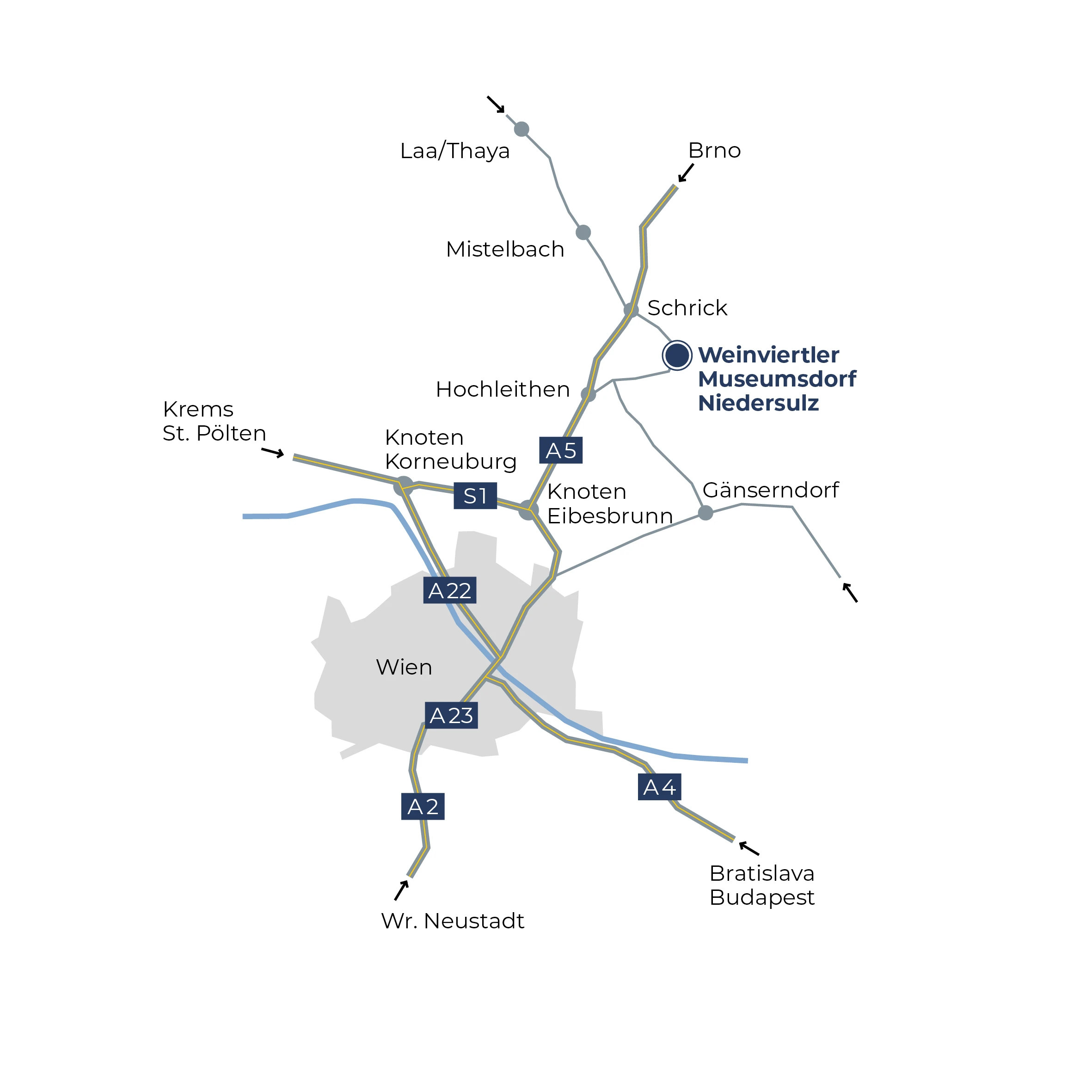 Fahren Sie über die Nordautobahn A5 bis zur Abfahrt Schrick und folgen Sie den Wegweisern (braune Kulturwegweiser), die Sie an jeder Kreuzung finden, bis zum Weinviertler Museumsdorf Niedersulz.